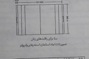 عمق استخرهای واترپولوی استاندارد برای بازیهای المپیک حداقل (۵٫۹) ۱٫۸in و برای رده های سنی پایین حداقل (۳٫۹) ۱٫۲m باید باشد. ابعاد زمین مسابقه که در واقع همان استخر شنا است عبارت است از: استاندارد المپیک استاندارد باشگاهی در تصویر(۱۱)
